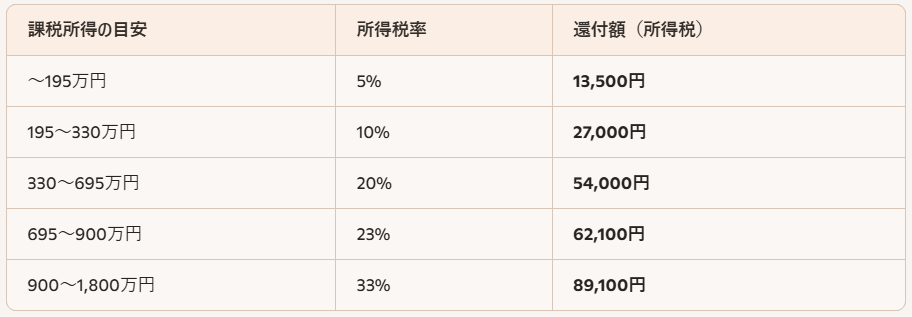 税率は所得によって違いますが、最も多いケース(年収300~400万円台)なら所得税率10%で、27,000円戻ってきます!